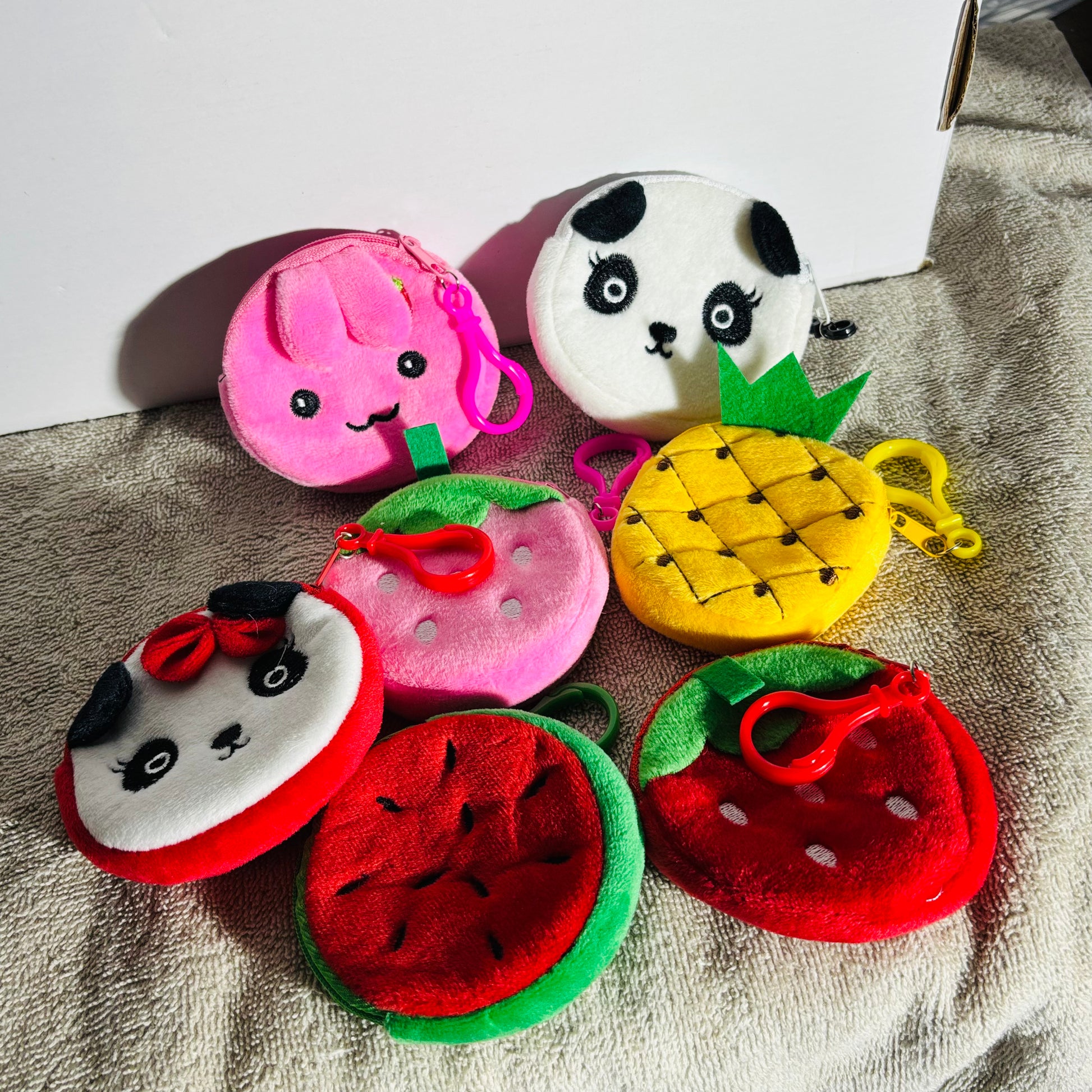 With every order, you’ll receive one mystery plush coin bag chosen at random from approximately 6 different designs. Themes include pandas, fruit-inspired styles, and a pink rabbit. Each one is a surprise—collect them all!